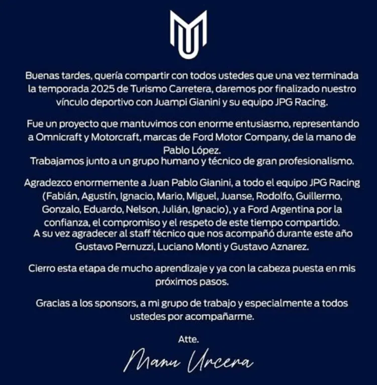 “Quería compartir con todos ustedes que una vez terminada la temporada 2025 de Turismo Carretera, daremos por finalizado nuestro vínculo deportivo con Juampi Gianini y su equipo JPG Racing. Fue un proyecto que mantuvimos con enorme entusiasmo, representando a Omnicraft y Motorcraft, marcas de Ford Motor Company. Trabajamos junto a un grupo humano y técnico de gran profesionalismo”, expresó Urcera en un comunicado de prensa.